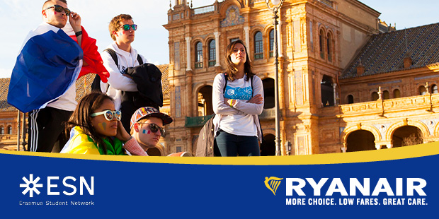 Ryanair supports Erasmus students by offering a 10% DISCOUNT in 4 single flights + FREE LUGGAGE with your ESNcard!